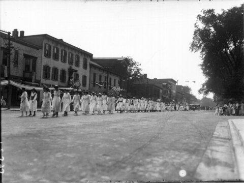 Suffragette city! But how come everyone except one person is wearing the sash in the wrong direction?