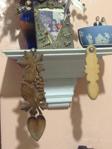 A friend was recently in Wales, which reminded me to look at the wedding shelf above our kitchen table. My Auntie May (1902-92) gave us the Welsh love spoon on the left, & someone else gave us the less ornate one. Grapes and leaves mean "love will grow."